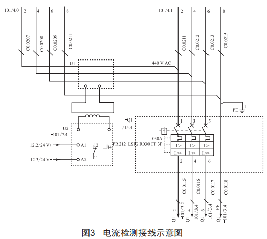 針對切換成市電運(yùn)行狀態(tài)后,因雙碳刷組取電使得四級接觸器方案不起作用、無法實(shí)現(xiàn)掉碳刷檢測的問題,我們提出采用電流檢測方案。綜合比較單相電流檢測和零序電流檢測兩種模式,最后選定利用零序電流檢測保護(hù),即:正常情況下三相電流的相量和等于零,公式為Ia+I(xiàn)b+I(xiàn)c=0,若出現(xiàn)集電小車某相掉碳刷的情況,這時(shí)穿過電流互感器的三相電流相量和不等于零,其相量和為Ia+I(xiàn)b+I(xiàn)c=I,通過與電流檢測保護(hù)裝置預(yù)定動(dòng)作電流值Ie相比較,如I>Ie,則電流繼電器保護(hù)動(dòng)作,經(jīng)PLC控制使大車停止動(dòng)作。故通過在其中一條主回路上加裝電流互感器及電流繼電器來實(shí)現(xiàn)在市電狀態(tài)下的相線掉碳刷檢測,電流檢測接線示意圖如圖3所示。