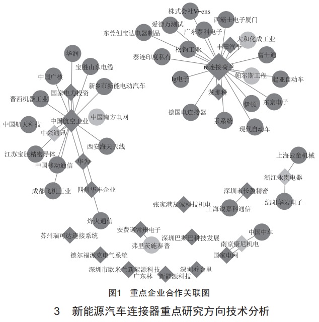 對(duì)重點(diǎn)企業(yè)進(jìn)行專利申請(qǐng)合作關(guān)聯(lián)分析,結(jié)果如圖1所示。國(guó)內(nèi)的中航光電和美國(guó)的TE連接形成兩個(gè)以其為核心的研究群體,其中,美國(guó)的TE連接曾用名TycoElectronics,即泰科電子有限公司,其在1998年收購(gòu)安普后成為連接器行業(yè)第一大生產(chǎn)企業(yè)。國(guó)內(nèi)的中航光電科技股份有限公司是中國(guó)航空工業(yè)集團(tuán)公司控股的股份制企業(yè),從合作關(guān)系中可以看出其產(chǎn)品覆蓋汽車、通信等多個(gè)領(lǐng)域,是"軍民融合"的典范,已經(jīng)成為國(guó)內(nèi)連接器行業(yè)的領(lǐng)軍企業(yè)。南京尼康、浙江永貴和深圳長(zhǎng)盈等也和不同申請(qǐng)人形成有共同申請(qǐng)關(guān)系,但大多數(shù)國(guó)內(nèi)新能源汽車連接器企業(yè)仍處于單兵作戰(zhàn)狀態(tài),沒有形成合作關(guān)系,建議這些企業(yè)在注重自身發(fā)展的同時(shí)多尋求合作,以期共同做大做強(qiáng)。