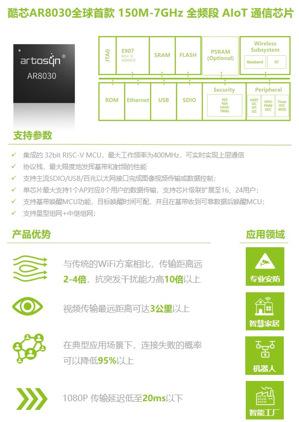 酷芯AR8030芯片是一款高集成度通信SoC芯片,該款產(chǎn)品以單芯片的方式集成了基帶、射頻以及上層通信協(xié)議棧,是全球第一款能同時支持150M-7GHz頻段的AIoT芯片。