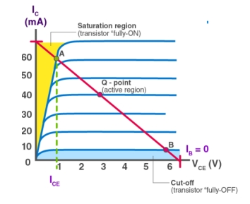 飽和區(qū)和截止區(qū)被稱為晶體管開關(guān)的工作區(qū)。這意味著,通過在其“最高關(guān)閉”(飽和)和“絕對關(guān)閉”之間切換,晶體管被用作開關(guān),基本上覆蓋其Q點和放大所需的分壓器電路。