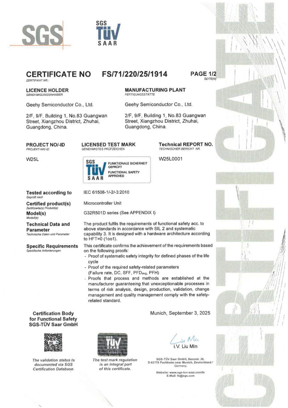 此次認證由中國SGS功能安全團隊率先完成對芯片技術方案、測試數據、STL庫、以及安全需求規(guī)格書(SRS)、架構設計文檔、FMEDA報告、安全手冊等文檔體系的全面初審,隨后由德國SGS-TüV-SAAR進行終審,以國際頂尖的審核視角驗證芯片是否完全滿足IEC61508SIL2SC3的全球通用要求。中德雙審的嚴格把關,不僅意味著極海G32R501D通過了“本土適配性”與“國際通用性”的雙重考驗,更彰顯了其在功能安全設計上的硬實力,標志著該芯片可無縫對接全球工業(yè)領域的高安全等級應用場景,為極海拓展國際市場、提升品牌競爭力奠定了堅實基礎。
