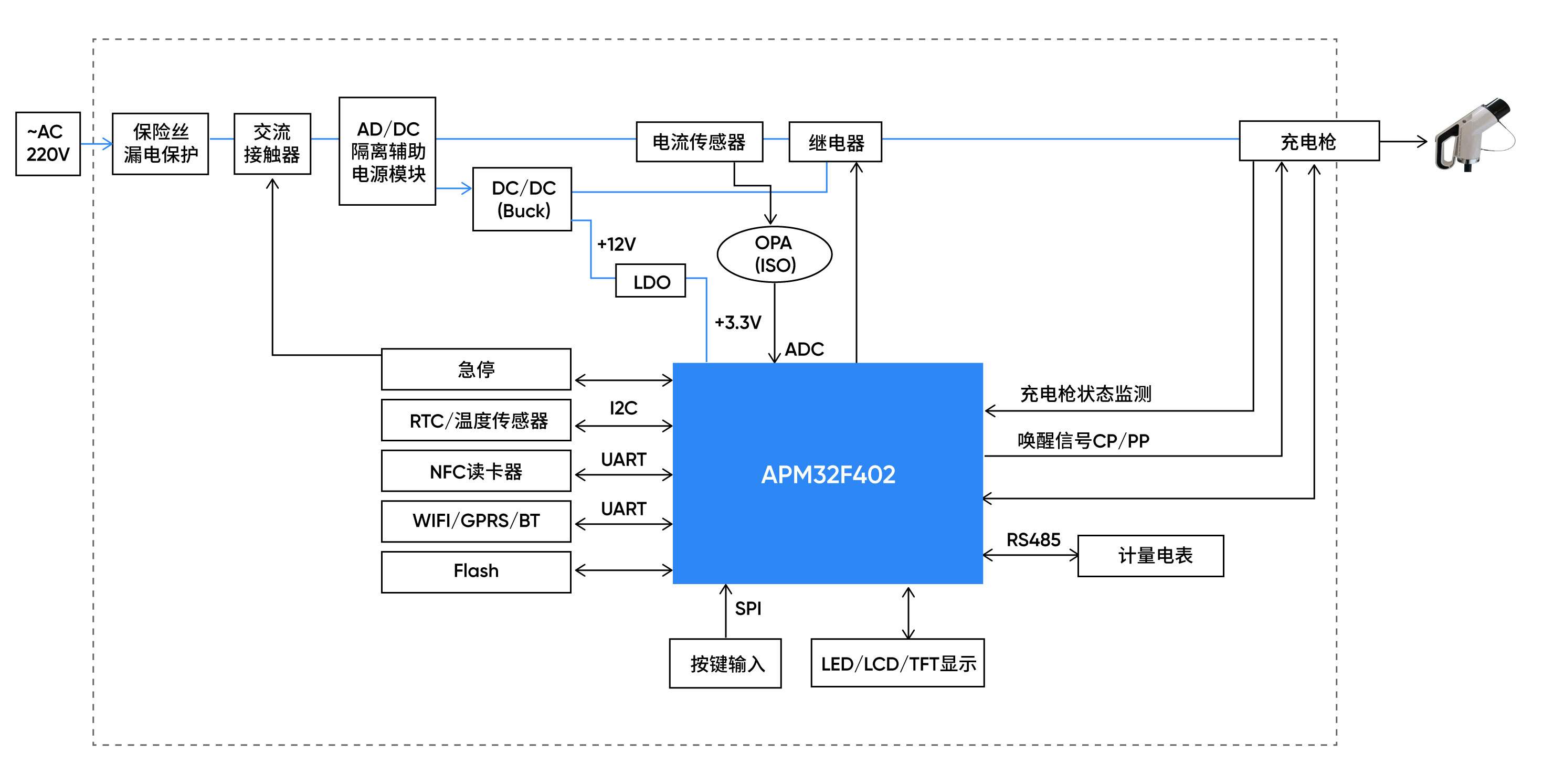 家用交流充電樁作為新能源汽車家庭充電的核心設(shè)備,既能滿足日常的充電需求,又具備安全適配、經(jīng)濟(jì)高效的特點(diǎn)。極海家用交流充電槍應(yīng)用方案,搭載基于Cortex-M4F內(nèi)核的APM32F402高性能高性價(jià)比MCU,主頻120MHz,具備高效運(yùn)算性能和豐富外設(shè)資源,可滿充電樁應(yīng)用在功耗、性能及性價(jià)比等方面的綜合需求。