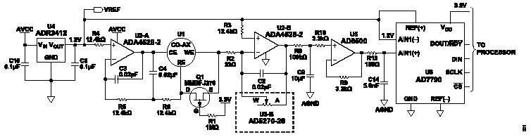 對于必須測量氣體濃度ppm比例的應(yīng)用,使用ADA4528-2和ADR3412使得電路性能適合與16位ADC接口,例如AD7790。