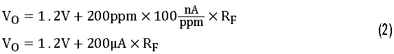 公式3顯示使用65 nA/ppm的傳感器典型響應(yīng)時,電路輸出電壓與一氧化碳的ppm所呈現(xiàn)的函數(shù)關(guān)系。