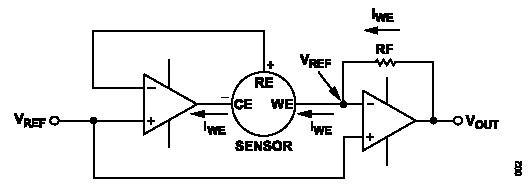 圖2顯示電化學傳感器測量電路的原理示意圖。電化學傳感器的工作原理是允許氣體通過薄膜擴散到傳感器內(nèi),并與工作電極(WE)相互作用。傳感器參考電極(RE)向放大器U2-A提供反饋,以便通過改變反電極(CE)上的電壓保持WE引腳的恒定電位。WE引腳上的電流方向取決于傳感器內(nèi)發(fā)生的反應(yīng)是氧化還是還原。一氧化碳傳感器發(fā)生的是氧化;因此,電流會流入工作電極,這要求反電極相對于工作電極處于負電壓(通常為300 mV至400 mV)。驅(qū)動CE引腳的運算放大器相對于VREF應(yīng)具有±1 V的輸出電壓范圍,以便為不同類型的傳感器(Alphasense應(yīng)用筆記AAN-105-03,設(shè)計恒電位電路,Alphasense公司)提供充足裕量。