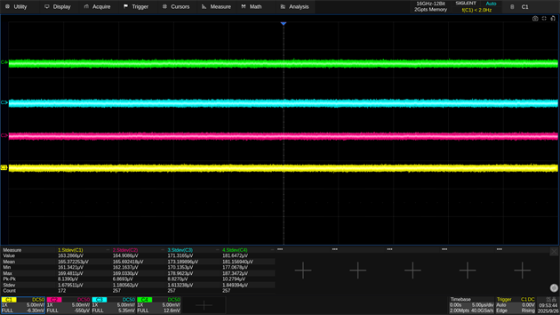 SDS8000A系列采用高性能硬件架構(gòu),四通道均可實現(xiàn)176 μVrms(typ.)的超低本底噪聲,該噪聲指標(biāo)與12-bit高分辨率完美匹配,有效降低儀器自身對被測信號的干擾,即便在高帶寬與高速采樣條件下,仍能保持信號的純凈度與真實性,為工程師在精密測量及前沿科研應(yīng)用中提供更可靠的波形保真度。