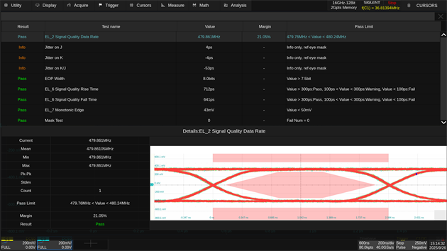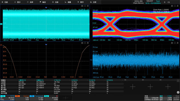 SDS8000A內(nèi)置專業(yè)的眼圖與抖動分析功能,能夠從高速串行數(shù)據(jù)中提取時鐘并生成清晰、穩(wěn)定的眼圖。系統(tǒng)支持一鍵式眼圖參數(shù)測量,包括眼高、眼寬、抖動(RJ/DJ)等關(guān)鍵指標(biāo),并集成信號均衡功能,改善波形質(zhì)量。用戶還可根據(jù)行業(yè)標(biāo)準(zhǔn)或自定義模板進(jìn)行眼圖測試,快速判斷信號質(zhì)量是否符合規(guī)范。此外,儀器提供抖動與噪聲成分的頻譜視圖與直方圖,便于深入分析各類噪聲與抖動來源,為高速接口的調(diào)試與信號完整性驗證提供完整解決方案。
