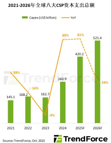 TrendForce集邦咨詢: 2026年CSP資本支出預(yù)計(jì)將高達(dá)5,200億美元,GPU采購與ASIC研發(fā)成創(chuàng)新高核心驅(qū)動力