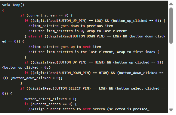 ?按鈕導(dǎo)航:它檢查按鈕按下(BUTTON_UP_PIN, BUTTON_DOWN_PIN, BUTTON_SELECT_PI),并相應(yīng)地調(diào)整item_selected索引。例如,按“上”會(huì)減少所選項(xiàng)目,而按“下”會(huì)增加所選項(xiàng)目。當(dāng)?shù)竭_(dá)菜單末尾時(shí),所選內(nèi)容環(huán)繞。