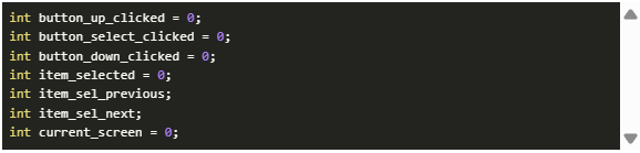 ?屏幕導(dǎo)航:基于當(dāng)前屏幕(current_screen),當(dāng)按下“選擇”按鈕時(shí),它在不同的屏幕之間切換。它要么轉(zhuǎn)到下一個(gè)屏幕(menu_item),要么返回到菜單屏幕(current_screen = 0)。