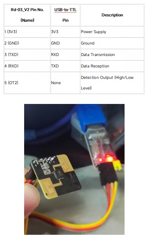 1. 使用USB-to-TTL轉(zhuǎn)換器將Rd-03_V2雷達模塊連接到計算機。