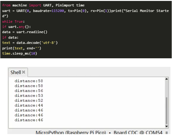 ?通過UART接收和打印距離測量數(shù)據(jù)。