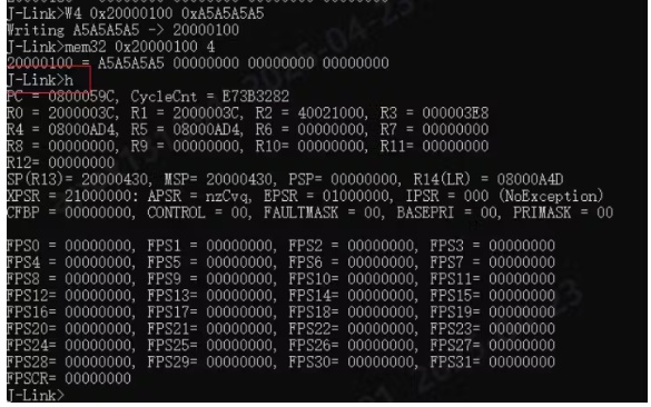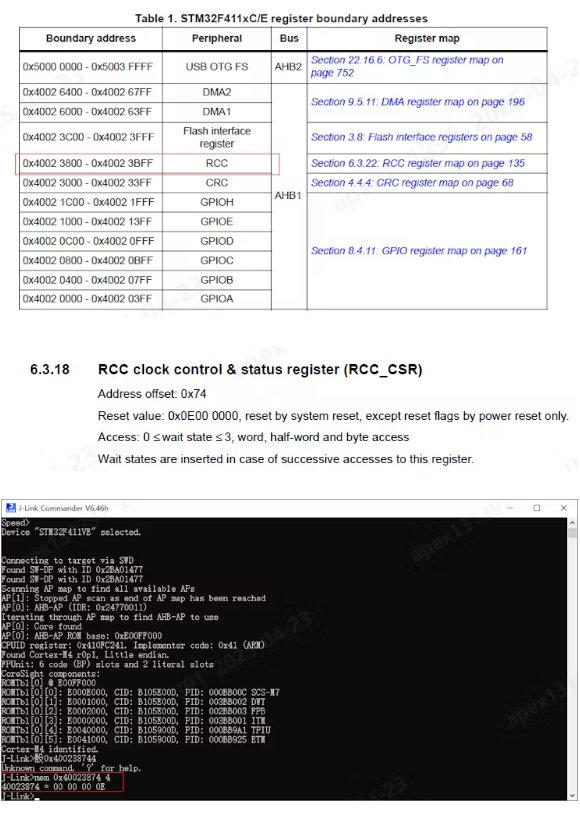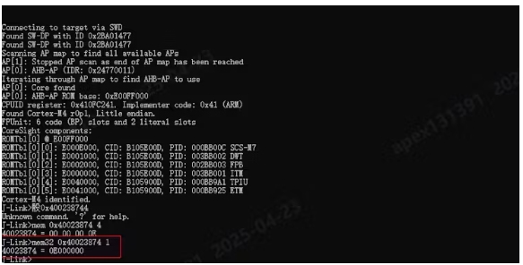 .例如,使用APM32F411芯片,要讀取地址0×40023800+0×74的RCC時鐘控制和狀態(tài)寄存器,您將輸入:mem32 0×40023874 1。