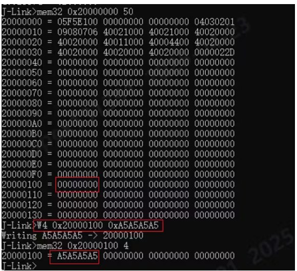 .例如,使用APM32F411芯片,要將數(shù)據(jù)0xa5a5a5寫入SRAM地址0×20000100,您將輸入:W4 0×20000100 0xA5A5A5A5。