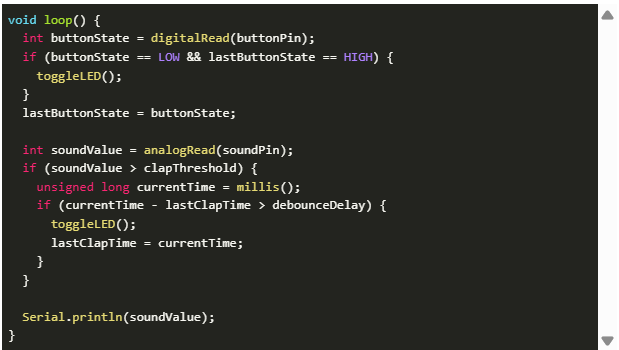 對于聲音傳感器,我們讀取0到1023之間的模擬值。當你拍手時,價值急劇上升。我們將其與閾值進行比較。如果它更高,我們把它當作鼓掌。