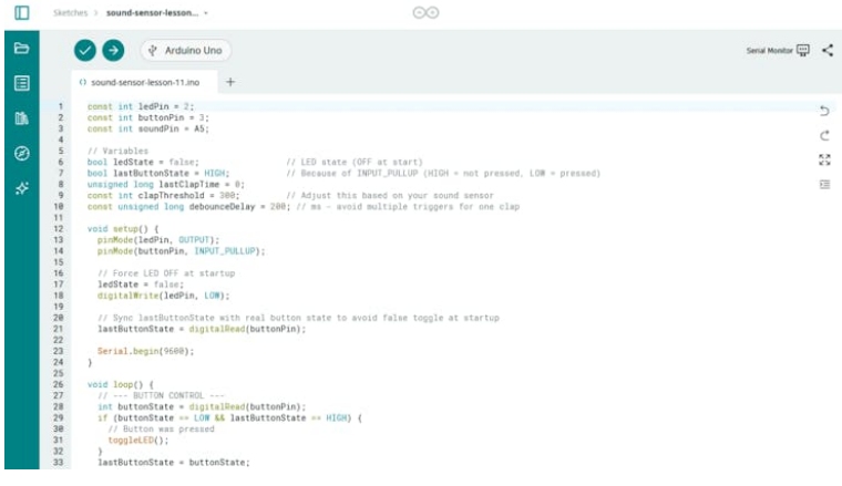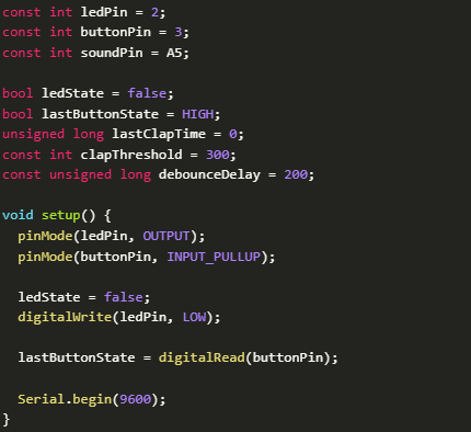 我們從定義引腳開始:引腳2上的LED,引腳3上的按鈕,以及A5上的聲音傳感器。我們還設(shè)置了一個變量來記住LED當前是打開還是關(guān)閉。