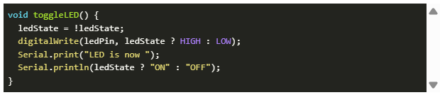 按鈕和拍擊檢測都調(diào)用相同的函數(shù):toggleLED。這個功能只是翻轉(zhuǎn)LED的狀態(tài)。如果它開著,就把它關(guān)掉。如果它關(guān)了,就打開它。