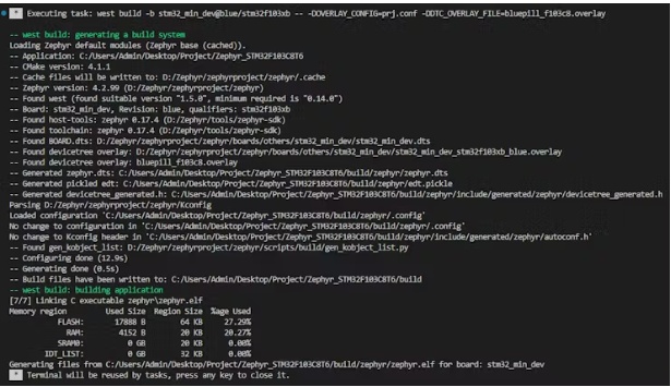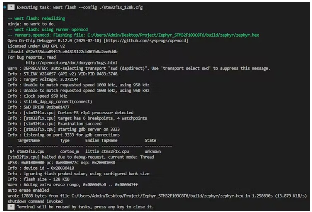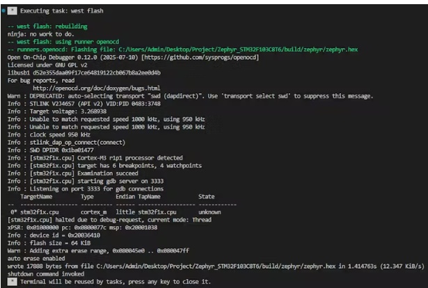 PC13上的LED現(xiàn)在應(yīng)該每秒閃爍一次。您剛剛運(yùn)行了第一個(gè)Zephyr應(yīng)用程序!