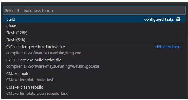 任務(wù)。json:定義Build、Flash和Clean腳本。它還包括一個(gè)Flash (128k)任務(wù),因?yàn)橐恍〤8T6主板秘密包含一個(gè)128kb閃存的芯片。如果標(biāo)準(zhǔn)閃存失敗,這個(gè)替代任務(wù)通常可以解決問(wèn)題。