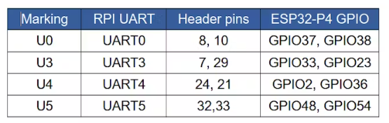 在Waveshare的ESP32-P4板上,ESP32-P4的UART0連接到擴展頭的8和10引腳(在Raspberry Pi的GPIO14和15 - UART0上)。但與此同時,這些引腳還在板上連接UART-USB橋接進行編程調(diào)試,使這些引腳無法使用。相反,我們可以為樹莓派的其他uart使用替代引腳: