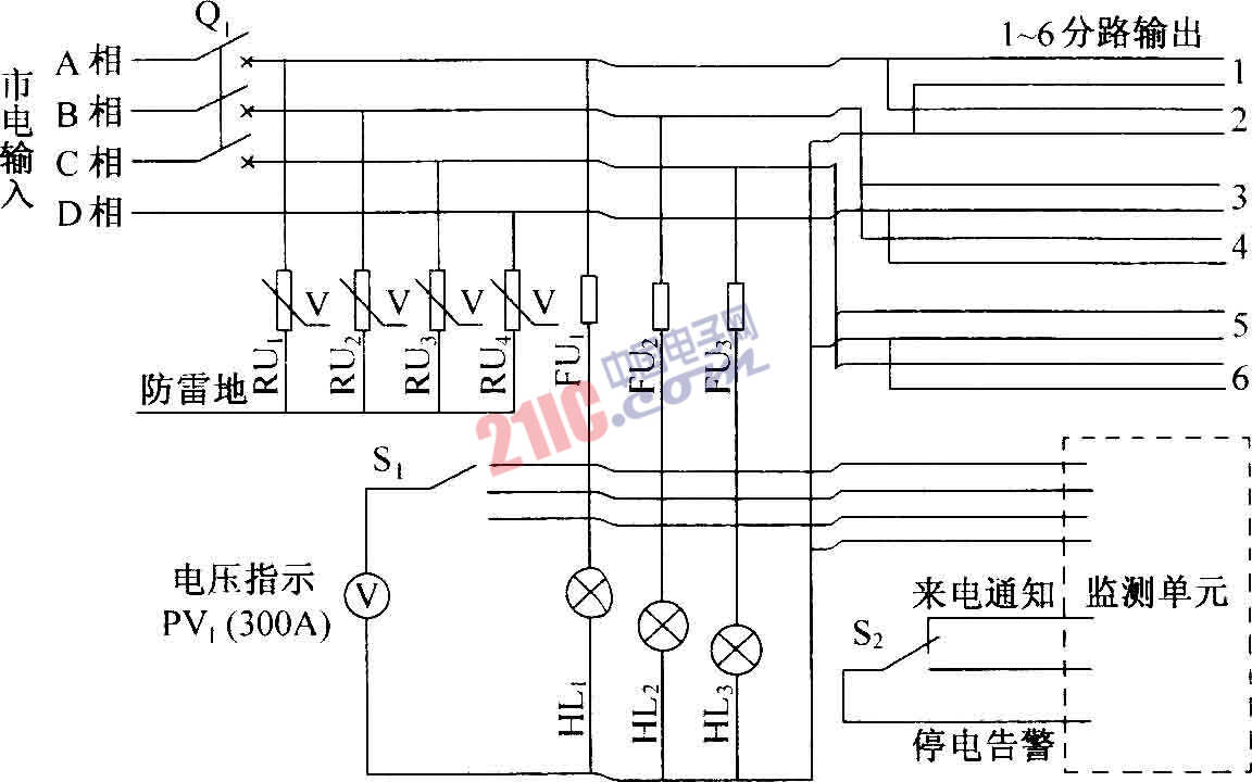 DUT07高頻開關(guān)電源系統(tǒng)是以DZW75-48/50(50II)型整流器模塊為基礎(chǔ),配以JP50-50II)型交流配電箱。如圖所示為P50-交流配電箱原理圖。